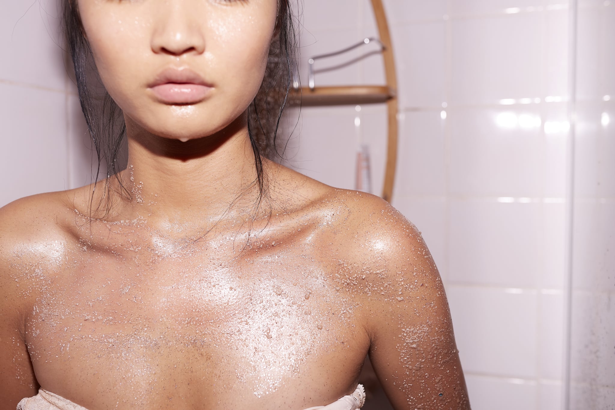 Once your skin is wet, cover your body in scrub. Scrub in circular motions for a few minutes, from top to toe.