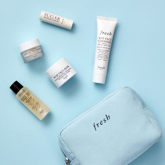 This 5-piece mini set features petite versions of fresh’s cult classics for clean, hydrated, luminous skin. Cleanse with Soy, hydrate with Rose, protect with Kombucha, smooth with Lotus, and replenish with Sugar Lip!