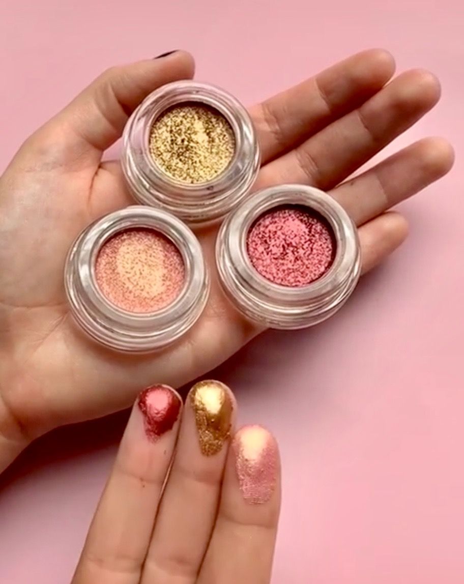 – 4 x 1 g Chrome Paint Shadow Pots in Citrine (metallic copper), Frosé (metallic rose gold), Wild at Heart (metallic pink duochrome shift), Pink Diamonds (metallic magenta)